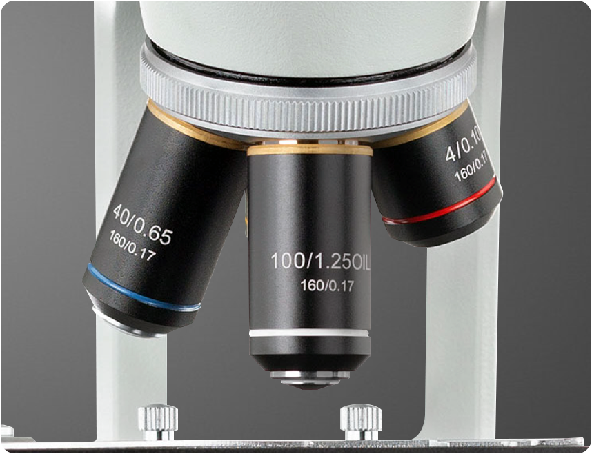 - Objective Lenses: 4X, 10X, 40X (spring-loaded), 100X (oil immersion, spring-loaded). Covers standard magnification range for biological applications.